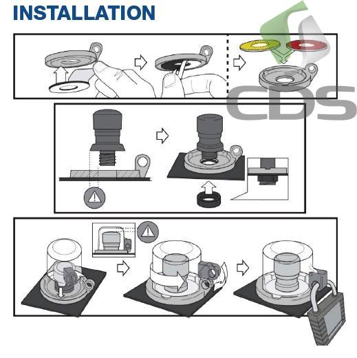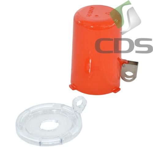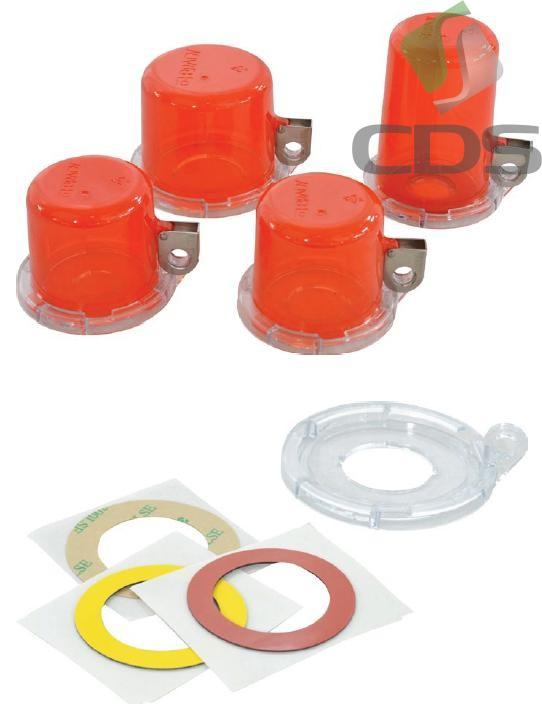 Uniwersalny blokada do przycisków w standardzie IEC i NEMA. Podstawa blokady jak i kopułka są rozpinane. Transparentna czerwona kopułka umożliwia podgląd przycisku. Oczko zawiasach pozwala w pozycji zamkniętej powiesić kłódkę bezpieczeństwa uniemożliwiając osobom postronnym dostęp do przycisku. Każda podstawa dostarczana z jedną żółtą i jedną czerwoną etykietą.