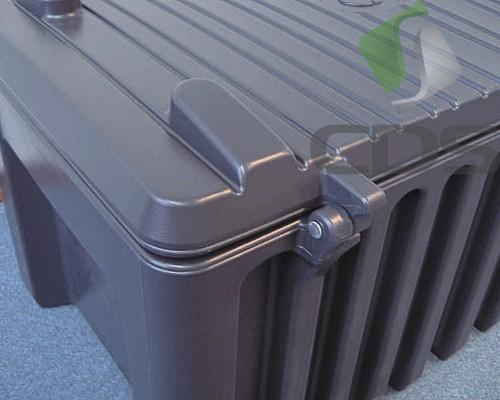 Pojemnik wykonany z polietylenu. Przeznaczony między innymi do transportu i przechowywania narzędzi oraz drobnych części. W podstawowej wersji skrzynia jest dostarczana bez dodatków. Szczelnie zamknięta pokrywa nie przepuszcza deszczu. Blokada pokrywy w pozycji otwartej. Pojemniki można ustawiać na sobie.