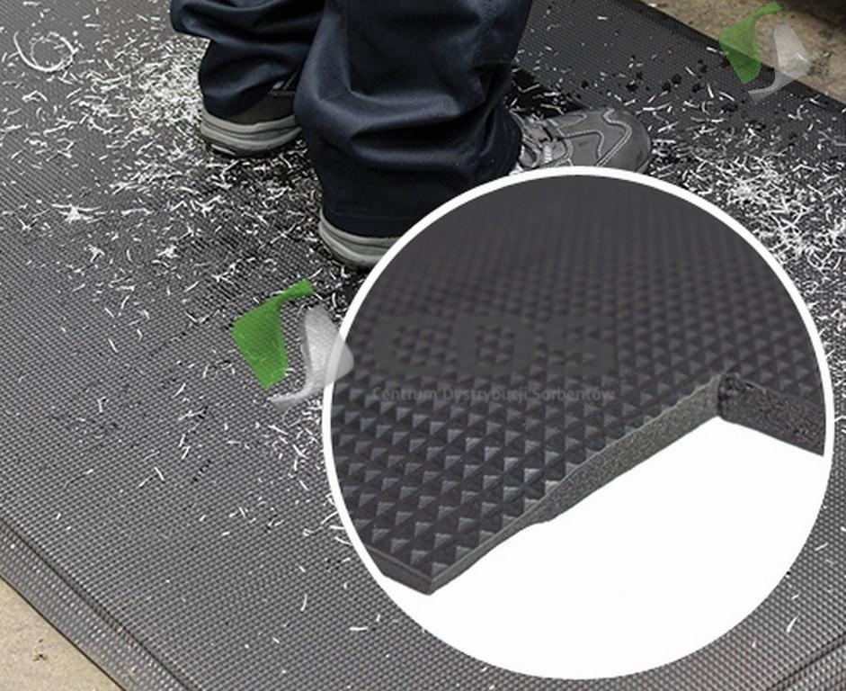 Piankowa mata antyzmęczeniowa otoczona z każdej strony rewolucyjnym materiałem PolyNit o zmniejszonej palności, odpornym na oleje maszynowe i środki chemiczne.