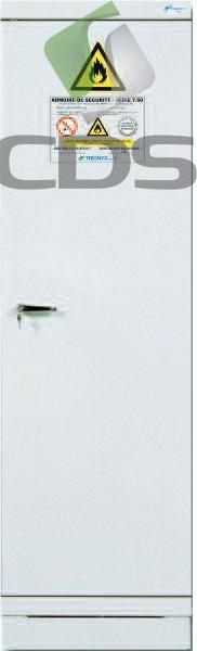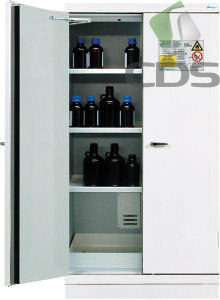Posiada odporną, dwupłaszczową konstrukcję z izolacją. Odporność pożarowa wynosi 60 min. Testowana wg DIN 12925-1,EN 14470-1. (Spełnia wymagania EU). Oznaczona symbolem zagrożenia wg ISO 3864. Drzwi wyposażone są w dwuobwodowy zamek cylindryczny. W przypadku pożaru drzwi zamykają się samoczynnie. Powierzchnia szafy pomalowana jest farbą epoksydową RAL 9010. W górnej części szafy znajduje się otwór fi 75/100 mm służący do wentylacji. Odnioodporna szafa dostarczana jest z 3 półkami (wanny wychwytowe) i jedna wanną wychwytową snajdującą się na podłodze. Do szafy można zamówić dodatkowe półki (wanny wychwytowe). Specjalnie polecana do przechowywania materiałów łatwopalnych, ale także innych niebezpiecznych substancji wg DIN 12925-1, EN 14470-1. Polecana dla przemysłu laboratoriów, szpitali itp.